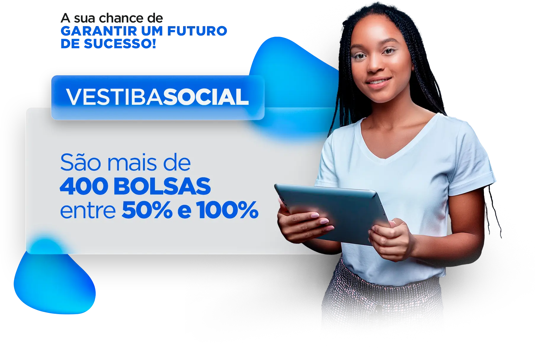 São mais de 400 bolsas divididas entre 100% e 50% que serão oferecidas para os candidatos do vestibular de acordo com sua pontuação e o enquandramento nas condições de concessão de incentivo estudantil, com renda familiar per capta de até 3 salários mínimos.